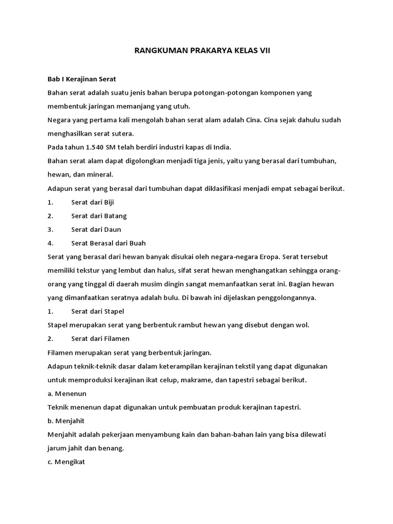 Mata pelajaran prakarya bertujuan untuk mengembangkan pengetahuan, keterampilan dan sikap percaya diri siswa melalui produk yang dihasilkan sendiri dengan memanfaatkan potensi sumber daya alam yang ada di lingkungan sekitar. Pada kesempatan kali ini, admin akan membagikan materi baru nih. Rangkuman materi prakarya kelas 7 bab 2. Jenis dan karakteristik bahan limbah lunak c. Rangkuman materi prakarya ini disusun dari buku bse kurikulum 2013 edisi revisi terbaru.
